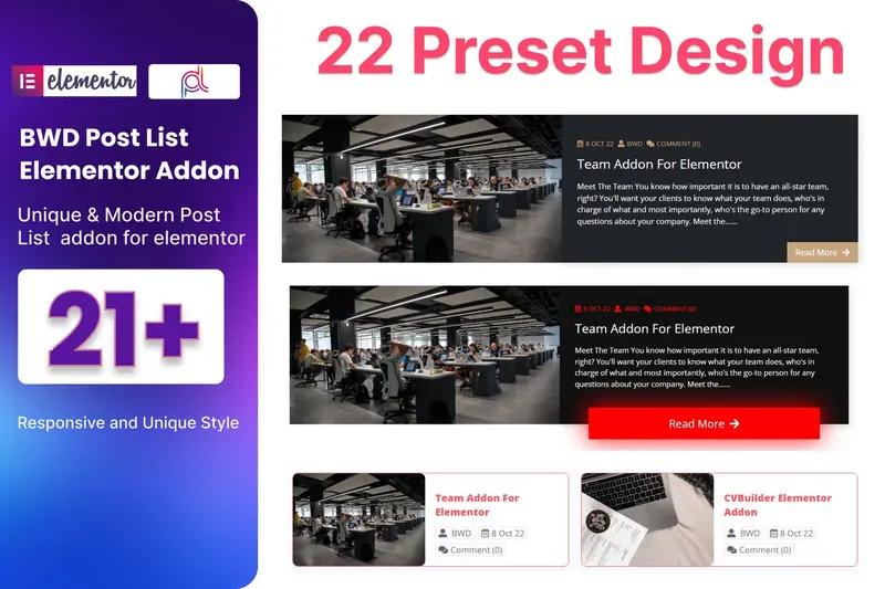 Blog Post List Addon For Elementor là một plugin WordPress nhẹ, tích hợp trên nền tảng Elementor, giúp bạn dễ dàng tạo ra các post list đẹp mắt mà không cần kỹ năng lập trình. Với 22 mẫu preset post list độc đáo, giao diện của bạn sẽ trở nên nổi bật và chuyên nghiệp. Đặc biệt, hơn 100+ thiết kế mới sẽ được cập nhật trong thời gian sắp tới, mở rộng tối đa khả năng tùy chỉnh cho website.