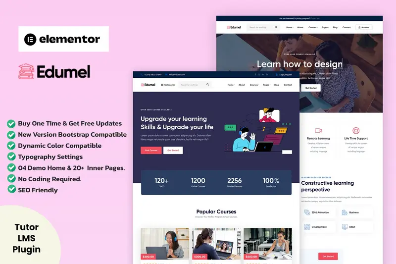 Edumel- Education LMS WordPress Theme được thiết kế chuyên nghiệp, hoàn toàn responsive và dễ dàng tùy chỉnh mà không cần coding. Theme tích hợp sẵn hơn 4 demo trang chủ dễ dàng chỉnh sửa với tính năng drag-and-drop trực quan. Đây là giải pháp LMS WordPress hoàn chỉnh, được tài liệu hóa chi tiết và hỗ trợ chuyên nghiệp để giải đáp mọi thắc mắc. Edumel còn trang bị đa dạng các trang nội bộ có sẵn cho phép bạn bắt đầu tùy chỉnh nhanh chóng, làm nổi bật website của mình. Theme tương thích với các plugin quan trọng như Elementor, Contact Form 7 và Tutor LMS.
