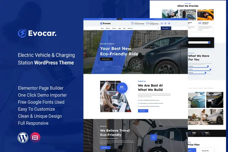 Evocar – Electric Vehicle & Charging Station WordPress Theme được thiết kế chuyên biệt dành cho các công ty cho thuê xe, trạm sạc xe điện, điểm sạc Tesla, dịch vụ cứu hộ xe, thuê xe tại các trạm xăng dầu và nhiều lĩnh vực liên quan khác như xe điện, trạm nhiên liệu, dịch vụ kéo xe tự động, điểm cung cấp LPG.