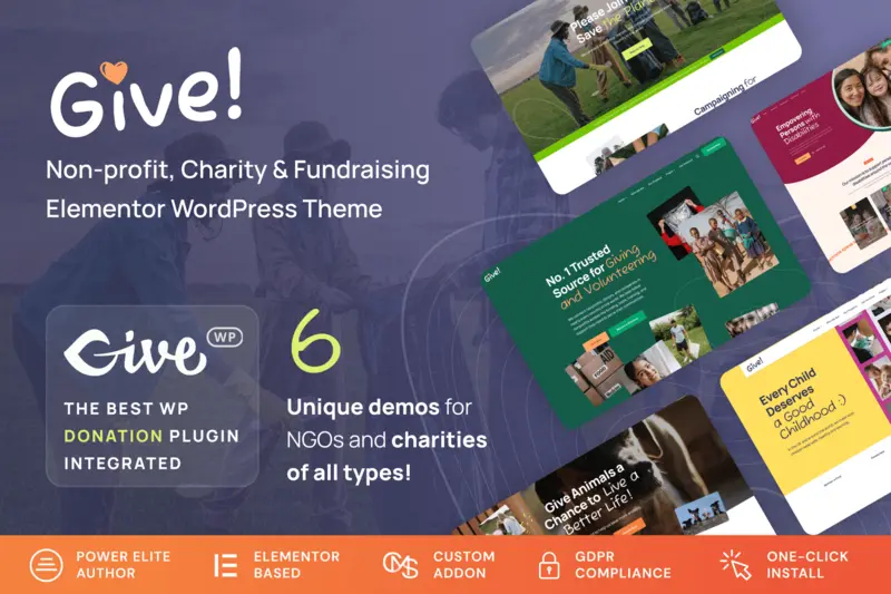 Give là một Charity WordPress Theme được thiết kế dành riêng cho các tổ chức NGO, các đơn vị gây quỹ, tổ chức phi lợi nhuận và các quỹ từ thiện chính phủ, tư nhân hoặc quốc tế. Theme này cung cấp nhiều bản demo chuyên biệt, giúp bạn dễ dàng xây dựng một website từ thiện chỉ với vài cú click đơn giản.