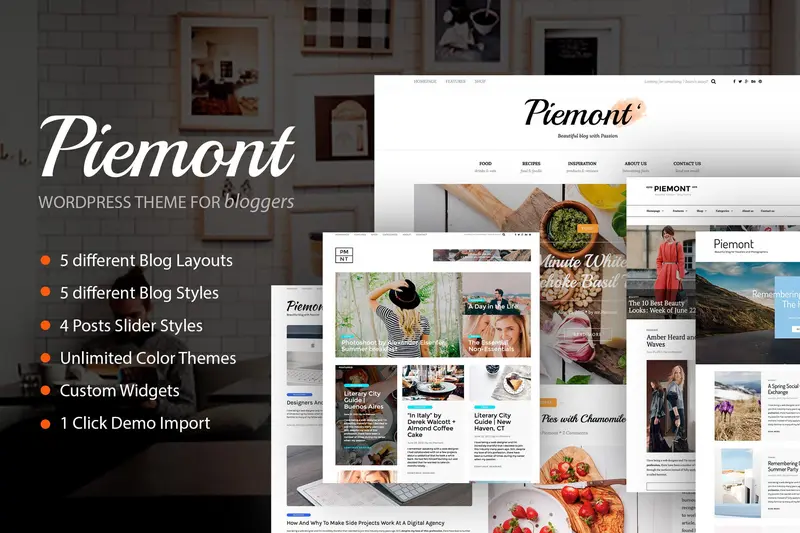 Piemont theme là một trong những WordPress Theme nhanh nhất, sạch sẽ và thẩm mỹ nhất, tích hợp đầy đủ hỗ trợ WooCommerce trên Themeforest. Theme này phù hợp với mọi nhu cầu cá nhân hoặc kinh doanh, giúp bạn dễ dàng tạo và ra mắt blog hoặc tạp chí WordPress chỉ trong 2 phút.