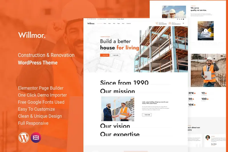 Willmor – Construction WordPress Theme được thiết kế chuyên biệt dành cho các công ty xây dựng, nhà thầu và chuyên gia trong ngành xây dựng. Với sự kết hợp hoàn hảo giữa thiết kế hiện đại, tính linh hoạt và các tính năng mạnh mẽ, Willmor mang đến trải nghiệm tuyệt vời khi xây dựng và quản lý website của bạn.