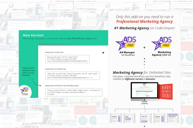 WordPress Marketing Agency – Ads Pro MA add-on giúp bạn xây dựng một hệ thống quảng cáo lớn trên WordPress với hơn 25 Template quảng cáo và hơn 20 kiểu hiển thị đa dạng. Thêm vào đó, add-on còn hỗ trợ cả các Website không dùng WordPress thông qua iframe, sử dụng hơn 25 Template quảng cáo với kiểu hiển thị mặc định. Với Marketing Agency add-on, bạn dễ dàng tạo lập cả hệ thống Marketing Agency toàn cầu (cho phép người dùng bán quảng cáo trên website của họ và bạn nhận hoa hồng) cũng như Marketing Agency riêng tư (bạn trực tiếp bán quảng cáo trên site của mình).