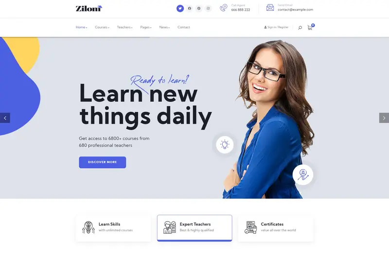 Zilom – Online Education Learning WordPress Theme sở hữu giao diện hiện đại, chuyên nghiệp, phù hợp cho mọi loại hình giáo dục như trường học, đại học, cao đẳng, học viện, trung tâm luyện thi, trung tâm ngoại ngữ, elearning, LMS hay các doanh nghiệp, nền tảng giáo dục trực tuyến khác. Theme được tích hợp bảng điều khiển cực mạnh với nhiều tùy chọn và công cụ hữu ích để bạn dễ dàng quản lý website: Elementor, Revolution Slider, Custom Icon Font… Theme còn áp dụng công nghệ web mới nhất như Bootstrap 5, SASS, HTML5, CSS3, Font Awesome.